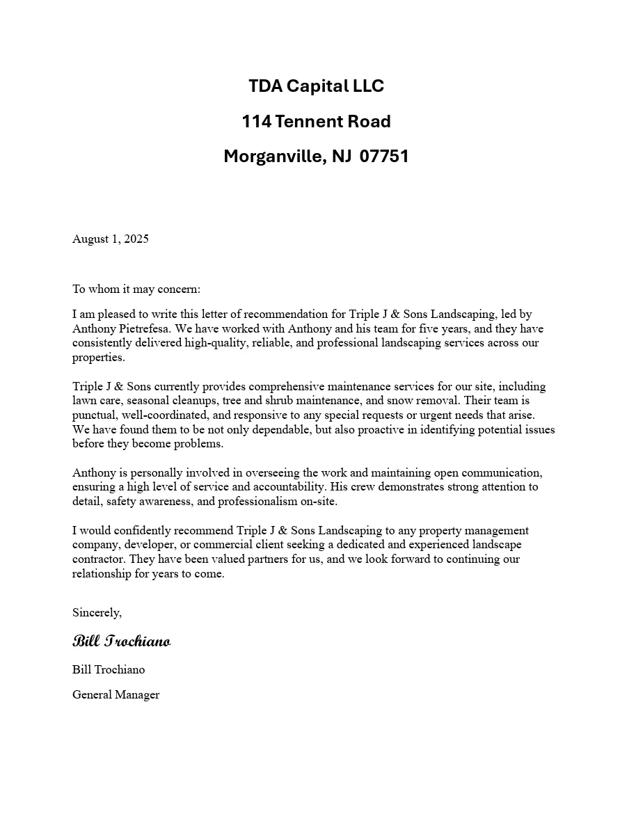 I am pleased to write this letter of recommendation for Triple J & Sons Landscaping, which has provided us with outstanding landscaping and property maintenance services for over 30 years. Throughout this long-standing relationship, they have consistently demonstrated a high level of quality, professionalism, and dependability.